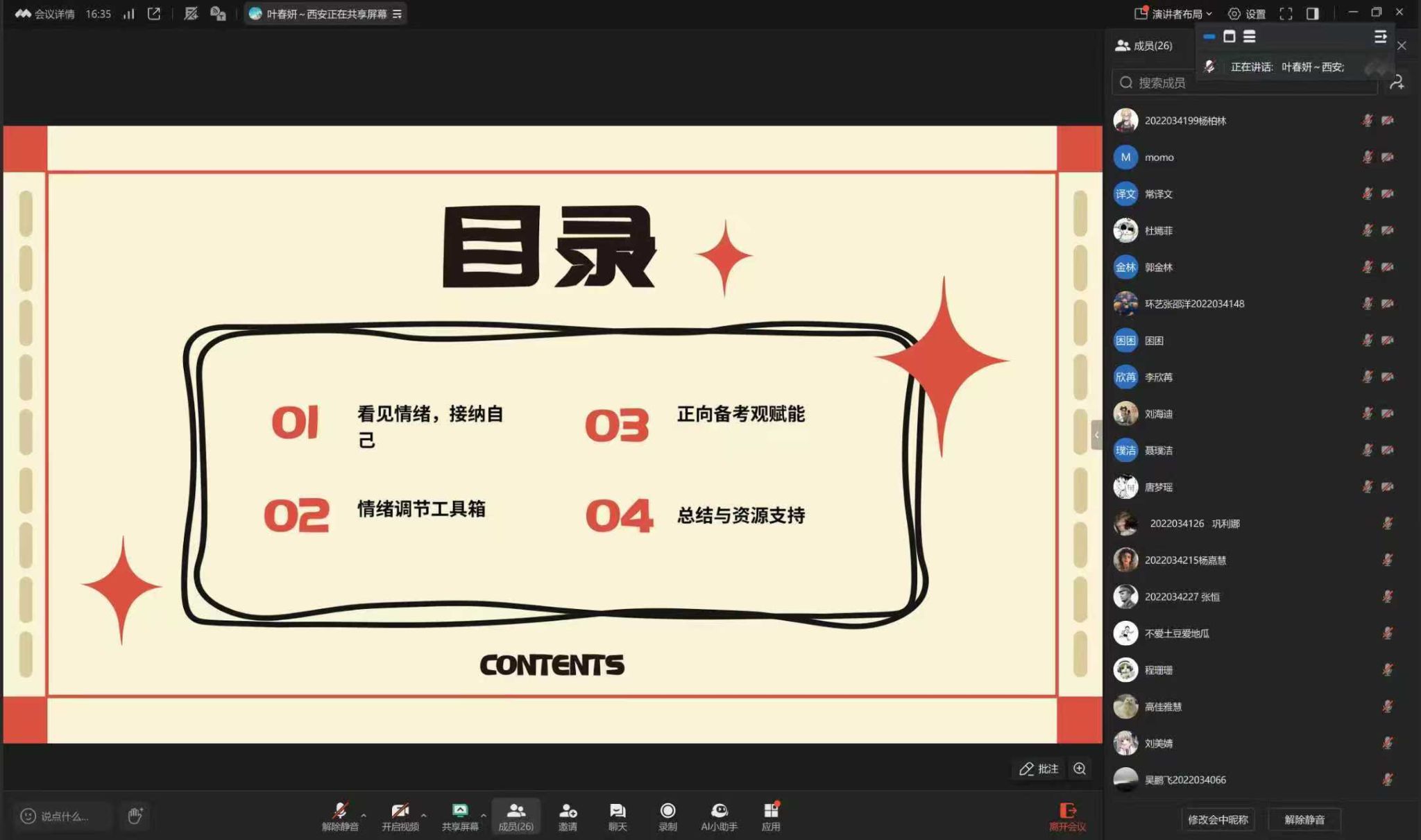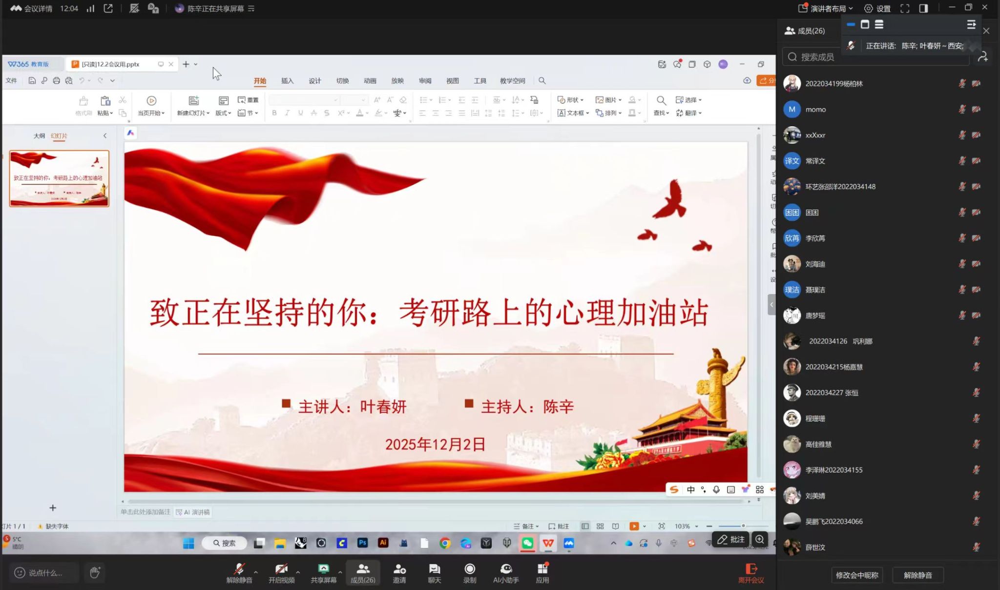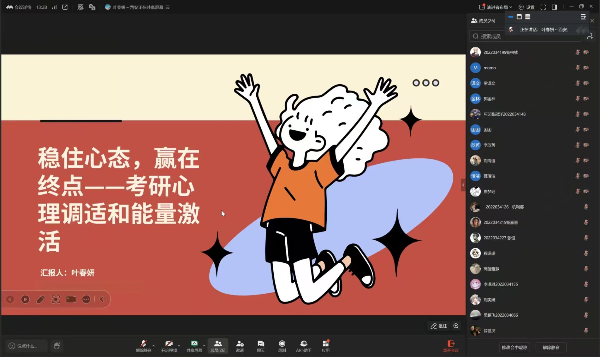 为帮助考研学生缓解压力,以更积极的心态迎接研究生考试。12月2日,设计学院特别邀请国家二级心理咨询师叶春妍老师为2022级研究生考试备考学生召开“稳住心态,赢在终点——考研心理调适和能量激活”线上心理赋能讲座,2022级辅导员陈辛主持。
