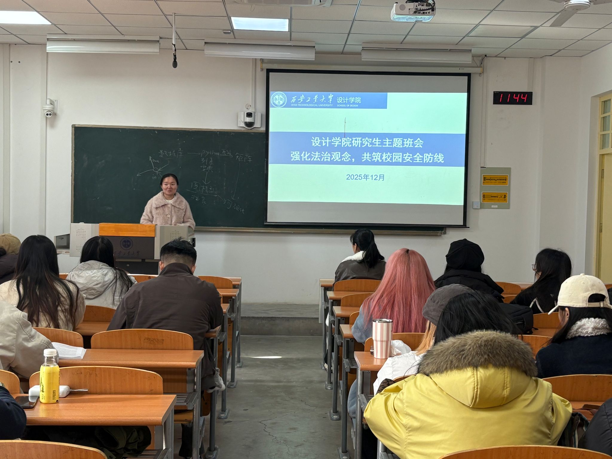 12月15日,设计学院研究生在教3-407开展“强化法治观念,共筑校园安全防线”主题班会,辅导员贾宇星主持。