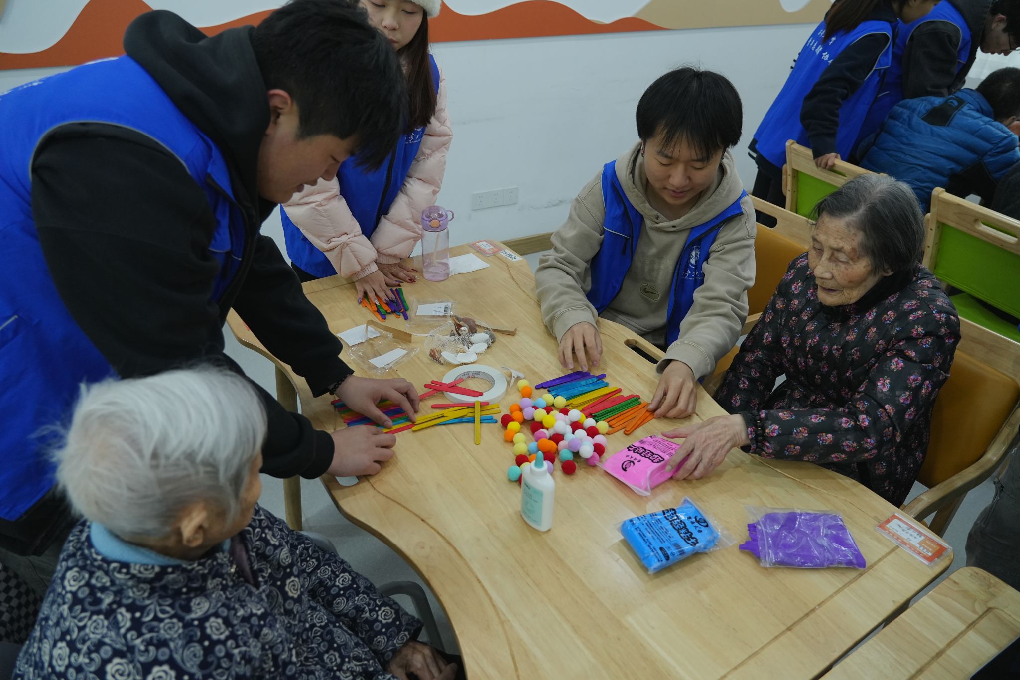 活动现场,志愿者们主动与老人们促膝长谈,耐心倾听老人讲述过往故事,细心询问身体状况和生活需求,贴心问候让敬老院暖意浓浓。随后,大家手把手指导老人制作手工,放慢节奏耐心讲解,陪伴老人细心完成作品,现场欢声笑语不断,氛围温馨和睦。