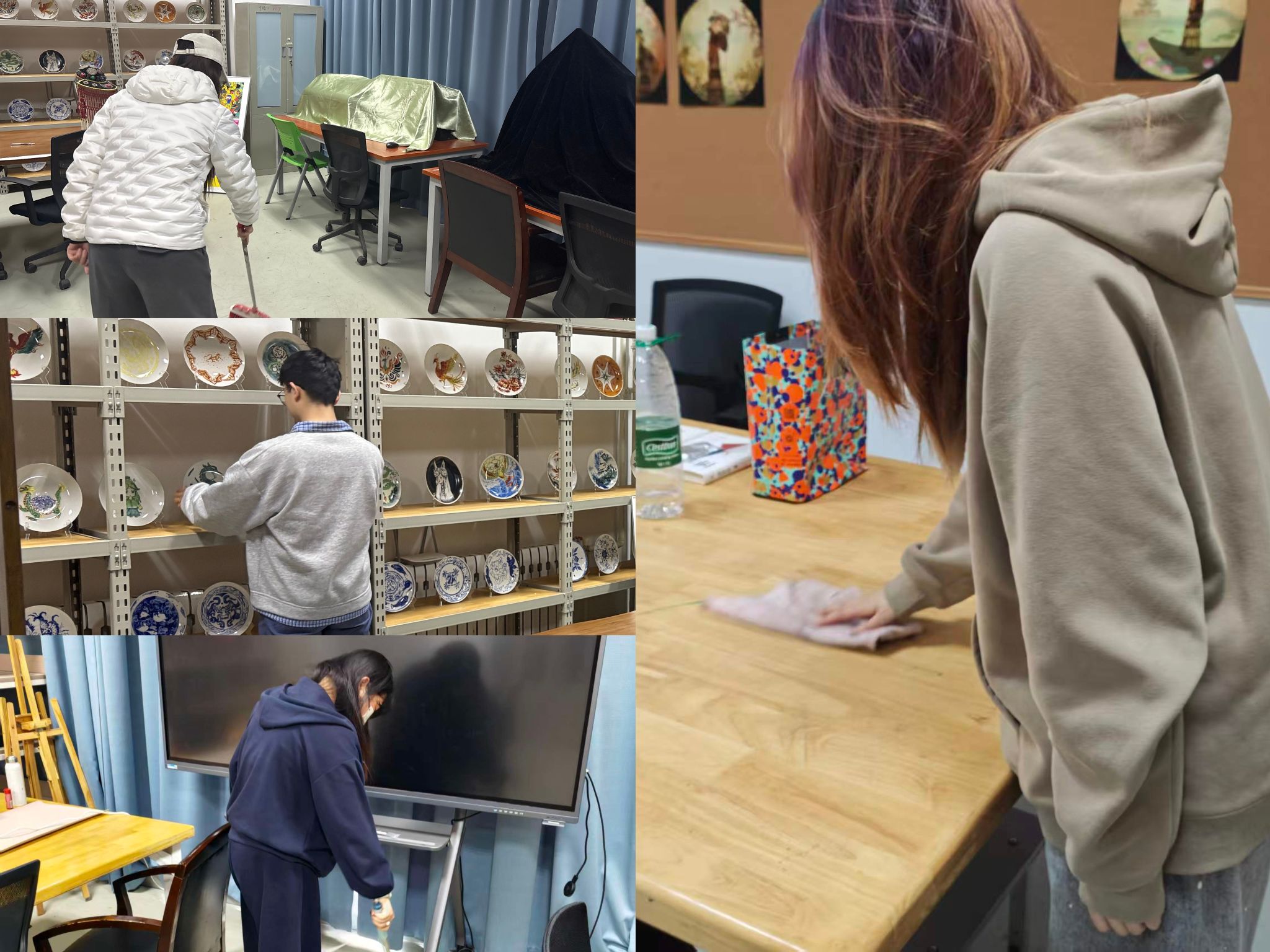 活动中,研究生们分工协作、有序配合,对实验室、研究室的台面、公共区域及卫生死角进行全面清扫整理,规范归置画材、工具与各类耗材用品,有效改善了学习创作环境,为艺术科研与设计创作筑牢环境基础。参与研究生表示,将自觉维护实验室整洁有序,养成良好学习与创作习惯,以积极饱满的状态投入科研实践。