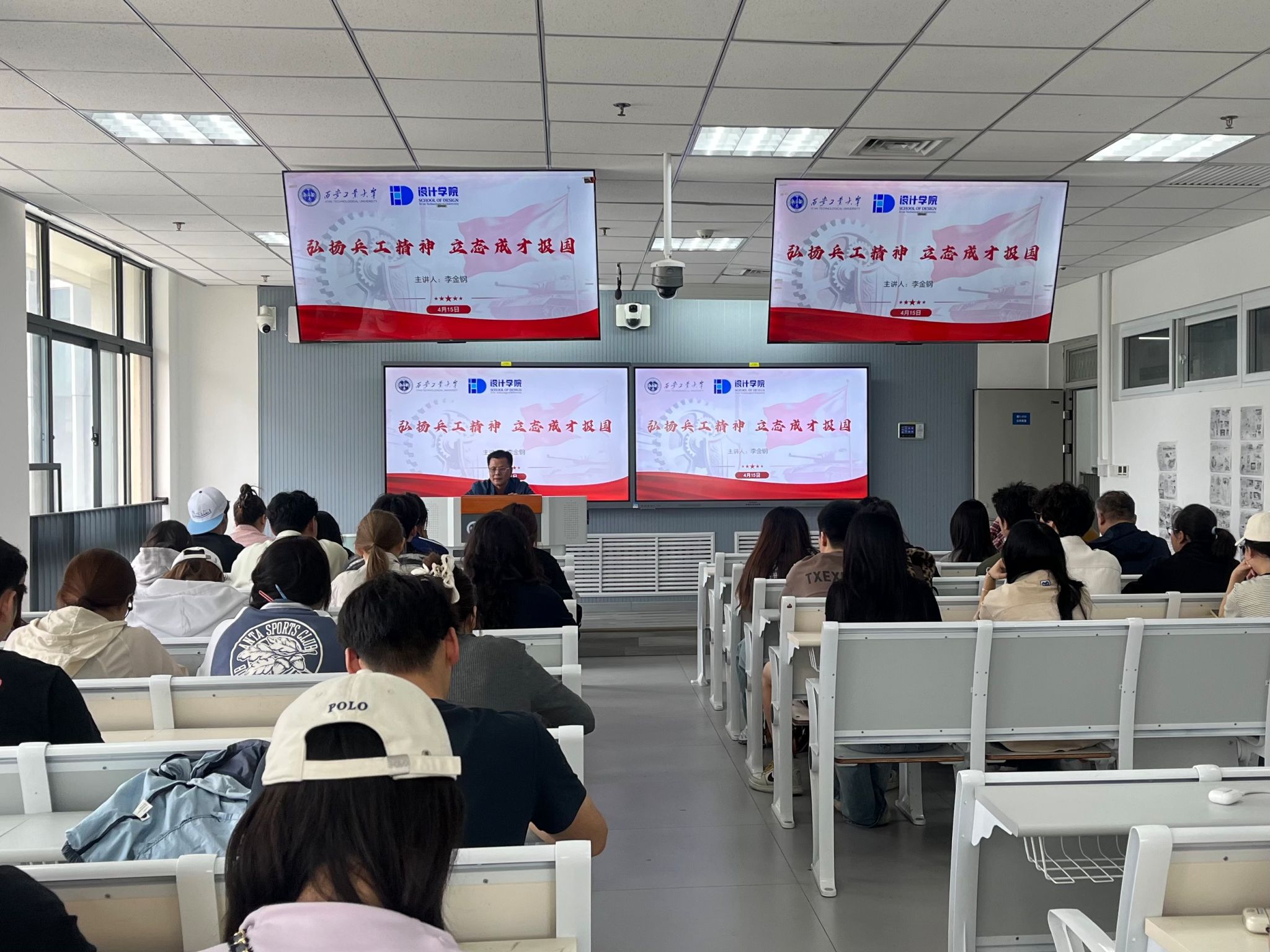 讲座中,李金钢将学校历史沿革与兵工精神凝聚发展相结合,生动讲述了学校在兵工背景下的发展变迁,以及校史背后所承载的兵工基因与家国情怀。同时,就青年学生如何传承人民兵工精神。李老师结合自身经历和典型案例,引导学生将兵工精神融入专业学习和日常实践,树立正确的世界观、人生观、价值观,鼓励学生立足设计专业特色,锤炼过硬本领,把个人理想追求融入国家发展大局。最后,他叮嘱学子们要铭记兵工历史、传承兵工精神,以校史中的奋斗故事为激励,坚定理想信念,勇于担当作为。