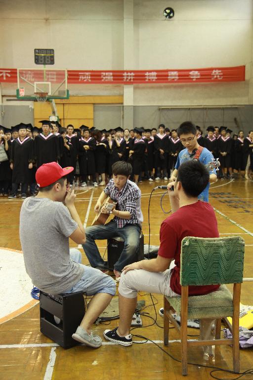 低年级学生用吉他组合为即将离校的学哥学姐们深情演绎了《老男孩》和《再见》,琴声与歌声触动了在场每一位学子心灵深处的情怀,很多学生的眼睛都湿润了,流露了他们对自己的成长和对母校的眷恋。